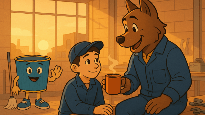 こっそり掃除している人、工具を整えている人、仲間に声をかけている人。
